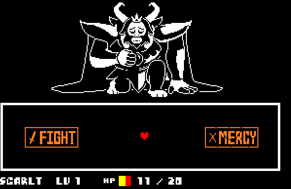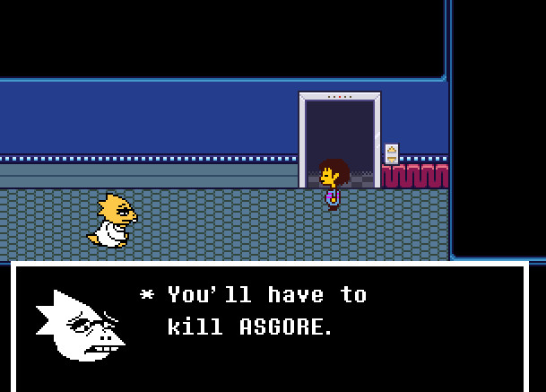 당신이 Asgore를 물리칠 때, 그는 그의 아들과 그의 아내와 같은 인간에게서 너무 많은 것을 잃은 것을 한탄할 것입니다. 그는 실제로 당신과 싸우고 싶어하지 않습니다. Asgore는 당신이