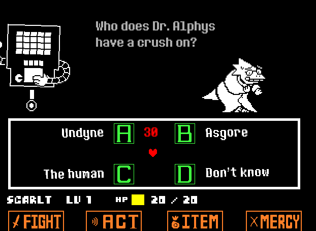 물론, 그는 그녀가 그를 언급하자마자 나타납니다. 게임 쇼를 할 시간입니다! Mettaton이 벽에서 폭발하여 퀴즈에 던집니다. 여기에서는 실제로 Mettaton과 싸울 수 없으므로 실제 전투가 아닙니다. Act 명령을 아끼거나 사용하고 그의 질문에 답하십시오. 당신은 당신이 원하는 대답에 당신의 영혼을 움직여야 합니다. 그의 질문은 불공평하고 스스로 대답하기가 불가능하지만 다행스럽게도 Alphys가 바로 당신을 도울 수 있습니다. 그녀는 그녀의 손으로 당신에게 대답을 깜박일 것이므로 그녀를 주시하십시오. 답은 어떤 이유로 필요하다면 다음과 같습니다.
