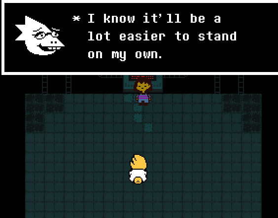 당신은 갈림길에 도달할 것이고 Alphys는 오른쪽으로 가자고 제안할 것입니다. 당신은 기사 기사에 의해 이 방에서 기습 당할 것입니다. 돌아가서 오른쪽으로 가십시오.