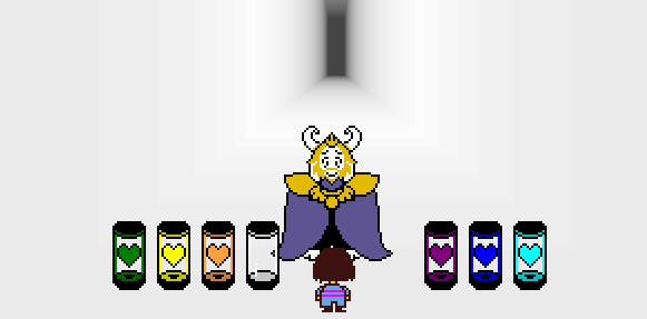 를 타고 MTT 리조트로 모셔다 드립니다. 버터스카치 파이와 눈사람 조각이 있는지 확인하십시오. 난 심각해! 이것은 당신이 게임을 끝내기로 약속한 돌아오지 않는 지점입니다. 당신이 Asgore와 싸우는 데 동의하면 여섯 영혼이 당신 주위에서 일어날 것입니다. 마지막 컨테이너가 비어 있습니다. 그것은 당신의 영혼을 위한 것입니다.