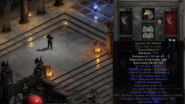 - Chains of Honor (Runeword) : 이 갑옷은 방어력을 높이는 데 탁월하며 모든 스킬에 +2를 제공하며 악마와 언데드 적에 대한 피해를 증가시킵니다.