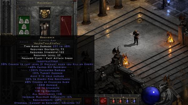 장비에 관해서라면 최고의 무기는 복종 룬워드 입니다. 갑옷의 경우 Fortitude Runeword 를 얻고 헬멧의 경우 Andarie's Visage를 원합니다 .
