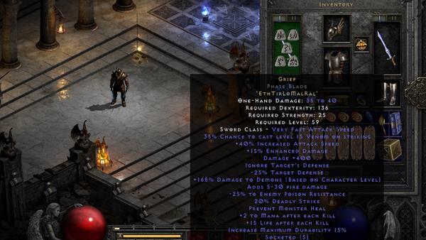 2x 슬픔 (Runeword) : 무기에 관해서는 몇 가지 다른 옵션이 있으며 주로 선호도와 경제에 따라 다르지만 최종 게임 콘텐츠를 지우 려면 2x 슬픔 이 가장 좋은 방법이라고 생각합니다. 슬픔은 막대한 양의 고정 피해를 제공할 뿐만 아니라 공격 속도 증가, 치명적인 일격 및 대 악마 피해를 제공합니다. 효율성을 극대화하려면 Phase Blades 에서 제작하는 것이 좋습니다 .