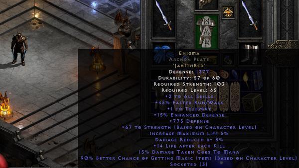 - 에니그마(룬워드) : 이 갑옷은 모든 스킬에 +2를 제공할 뿐만 아니라 많은 힘, 생명력 및 마법 찾기를 제공합니다. 텔레포트 기능은 목적지에 빠르게 도달할 수 있어 달리기 시간을 크게 줄여줍니다.