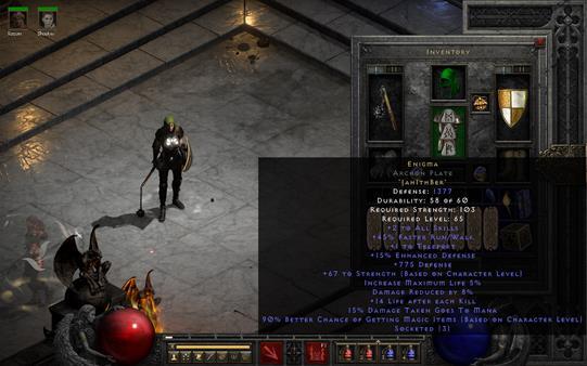 에니그마(룬워드) : 이 갑옷은 모든 스킬에 +2를 제공할 뿐만 아니라 많은 힘과 생명력을 제공합니다. 또한 지도를 빠르게 탐색할 수 있는 Teleport 주문을 제공합니다.
