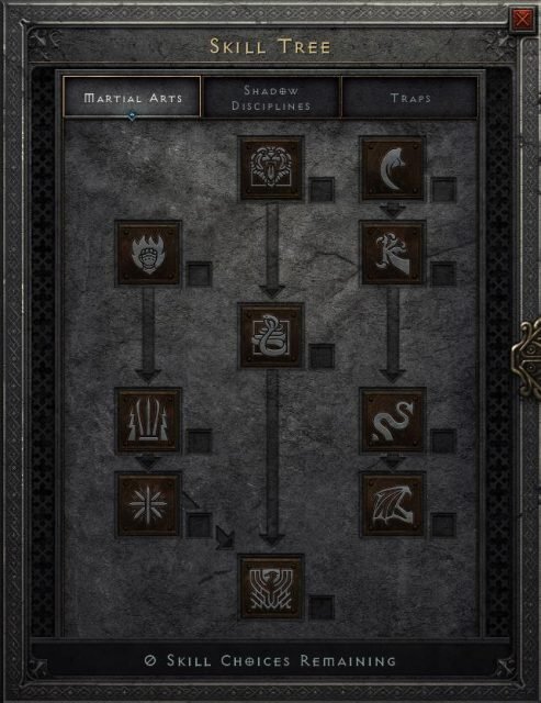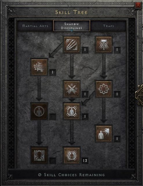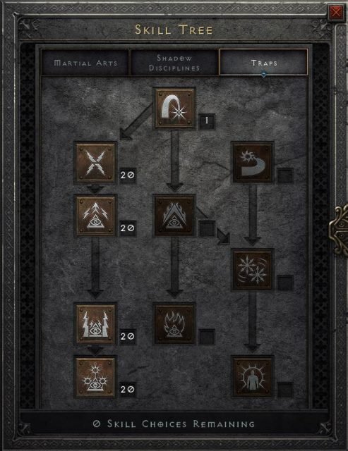 Lightning Trap Assassin은 Trap Skill Tree 에 중점을 두지 만 Shadow Disciplines Tree 에도 약간의 포인트를 투자해야 합니다 . 이 디아블로 2 부활한 암살자 빌드를 플레이할 때 다음 기술을 사용하게 됩니다.