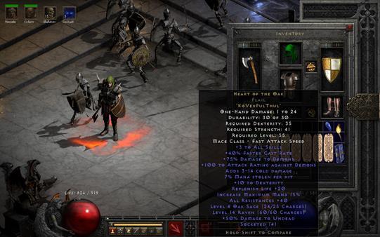Heart of the Oak(룬워드) – 이 무기는 모든 기술에 +3, 모든 저항 및 빠른 시전 속도를 제공합니다. 또한 하수인의 건강을 크게 증가시키는 lvl 4 Oak Sage를 시전할 수 있습니다.
