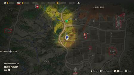 Sierra Perdida 지역 의 대략 중간 에는 Savannah Fields 가 있으며 서쪽 경계 에는 Bonilla 농장이 있습니다. "1"이라고 표시된 오두막 안에는 나무 상자에 들어 있는 Hermoso 가 있습니다.