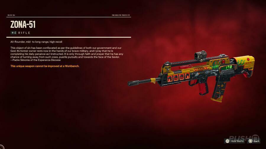 Far Cry 6의 오픈 월드 특성으로 인해 아래 나열된 순서대로 고유한 무기를 만나는 것은 불가능합니다. 이 가이드를 더 쉽게 따라갈 수 있도록 제목 메뉴의 순서를 복사했습니다. 그러나 이것은 또한 필요한 고유한 무기 중 하나를 찾지 못한 경우에 대비하여 어느 위치로든 빠르게 돌아갈 수 있음을 의미합니다. 게임의 어느 시점에서도 접근할 수 없는 곳이 없으며 스토리를 완료한 후 자유롭게 돌아다닐 수 있습니다. Armed to Teeth 트로피 를 잠금 해제하는 데 Ubisoft Connect 에서 구입한 고유 무기가 필요하지 않습니다 . 즉, 아래 나열된 53개 중 4개는 선택 사항입니다.