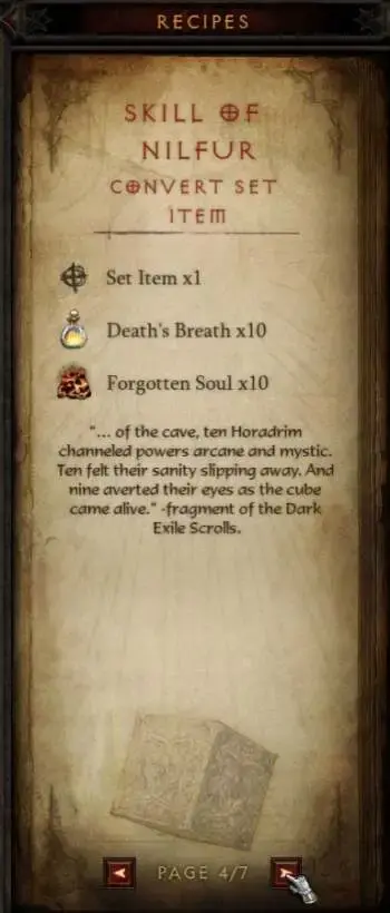 이 레시피는 전설적인 아이템을 파괴하고 큐브에 전설적인 접두사를 추가하여 캐릭터가 큐브를 통해 해당 능력을 활성화하고 아이템을 장착하지 않고도 즐길 수 있도록 합니다. 이것은 전설 접두사(주황색 텍스트로 표시)가 있는 모든 전설 또는 세트 아이템에 대해 수행할 수 있습니다. 항목의 다른 속성이 아닌 주황색 텍스트의 힘만 추출되며 큐브는 항상 가능한 가장 높은 롤에서 속성을 부여합니다.